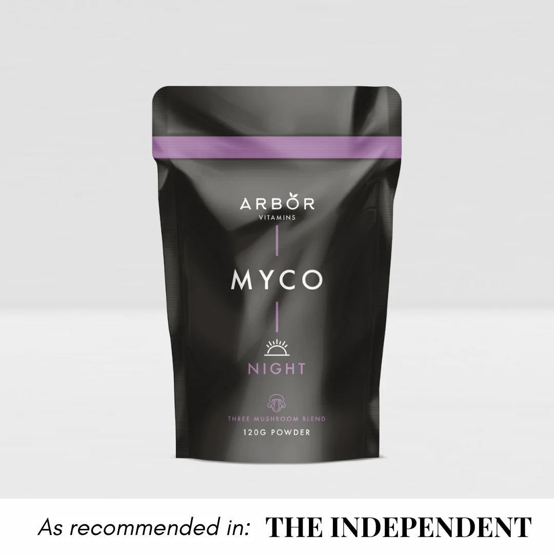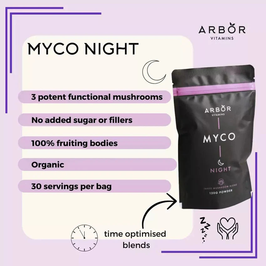 Introducing MYCO Night Blend by Arbor Vitamins—a soothing nighttime blend designed to support relaxation, deep sleep, and overnight recovery. Featuring Reishi, Tremella, and Maitake, this blend promotes restful sleep while nourishing your body and skin as you rest.