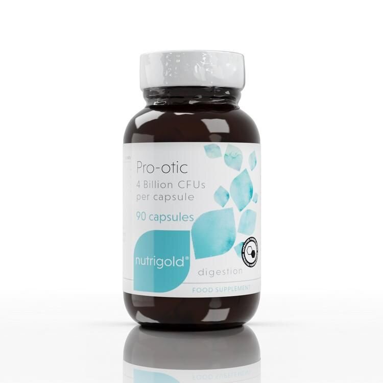 Nutrigold Pro-otic contains 4 proven strains of Lactobacillus and Bifidobacterium at 3 billion CFUs (Colony Forming Units) per capsule, providing support for intestinal microbial balance in both the small and large intestines. The small amount of pre-biotic fructooligosaccharides (FOS) now included in the Pro-otic formulation are not digested or absorbed but serve as a food for the bifidobacteria.
